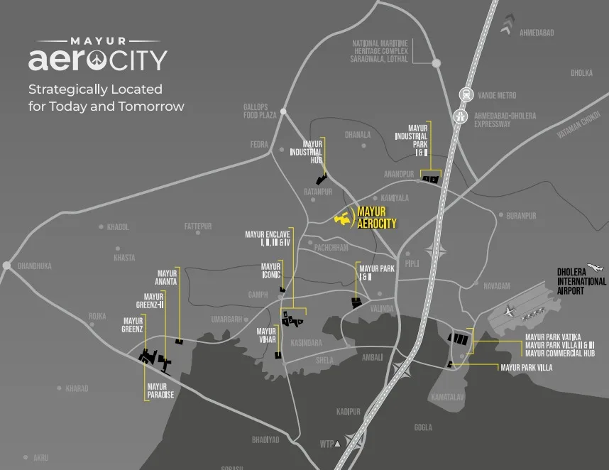 Mayur Aerocity is a residential plotting project in the developing Dholera region, offering planned plots for future home construction and long-term investment.