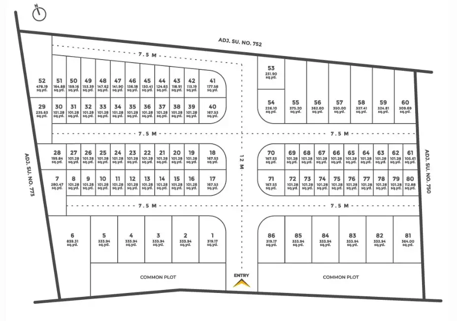 Yes, the layout includes organized plot divisions, internal roads, and basic infrastructure designed for ease of access and future development.